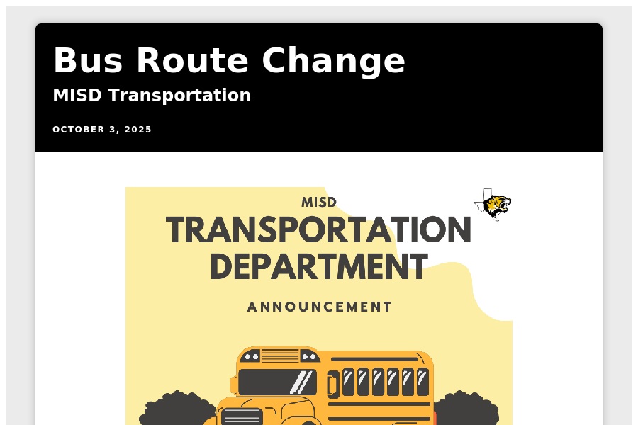 Bus Route Change MISD Transportation October 3, 2025