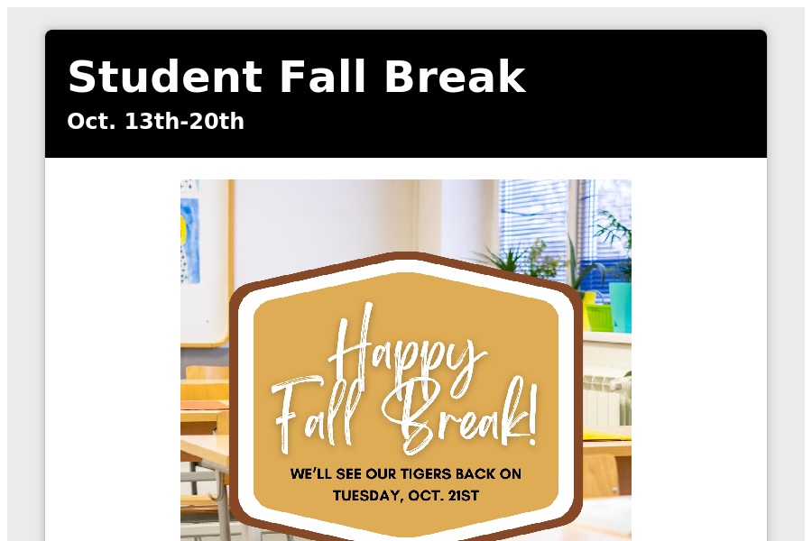 Student Fall Break Oct. 13th-20th We